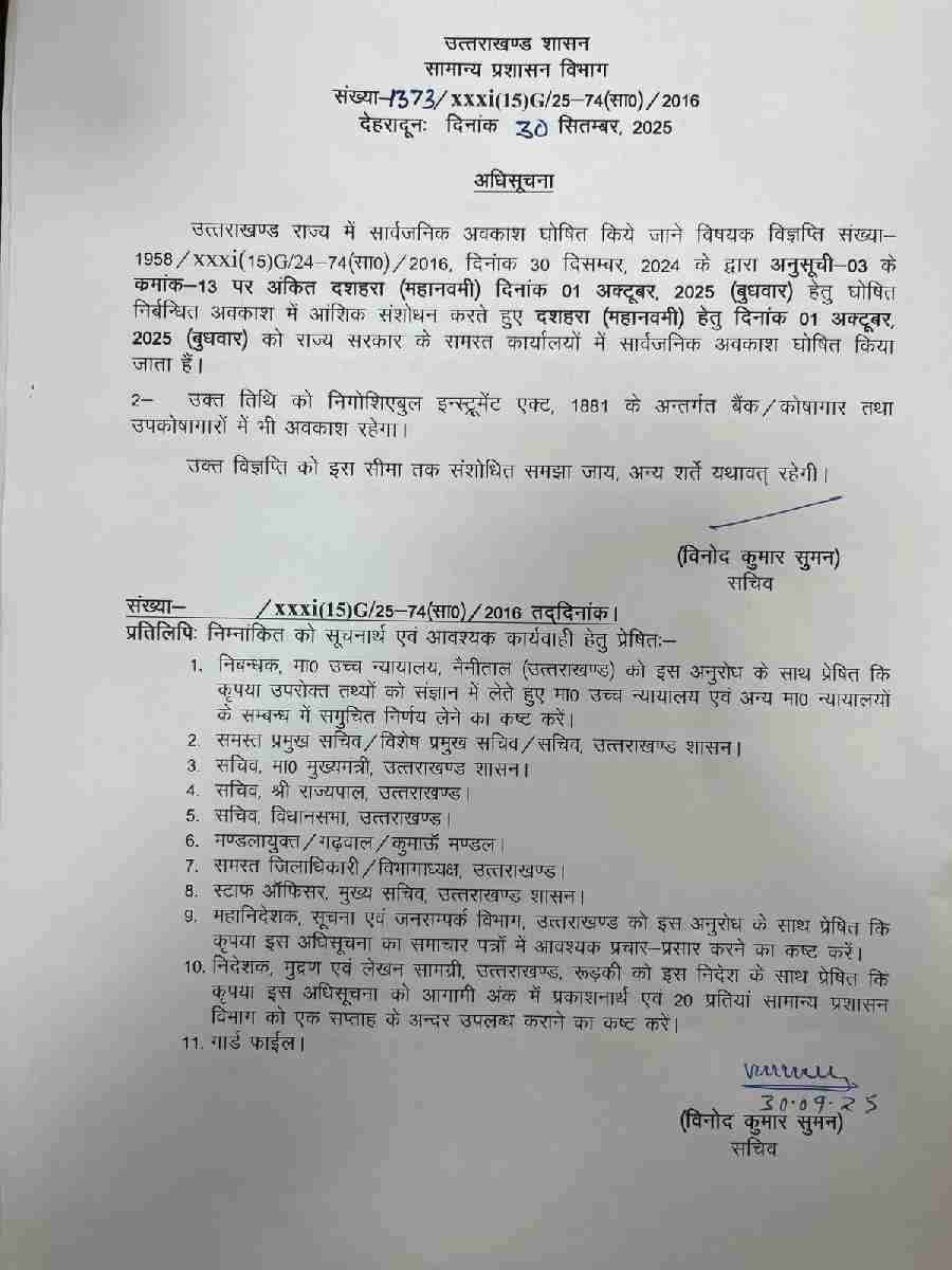 1 अक्टूबर महानवमी को प्रदेश में सार्वजनिक अवकाश की घोषणा, आदेश जारी